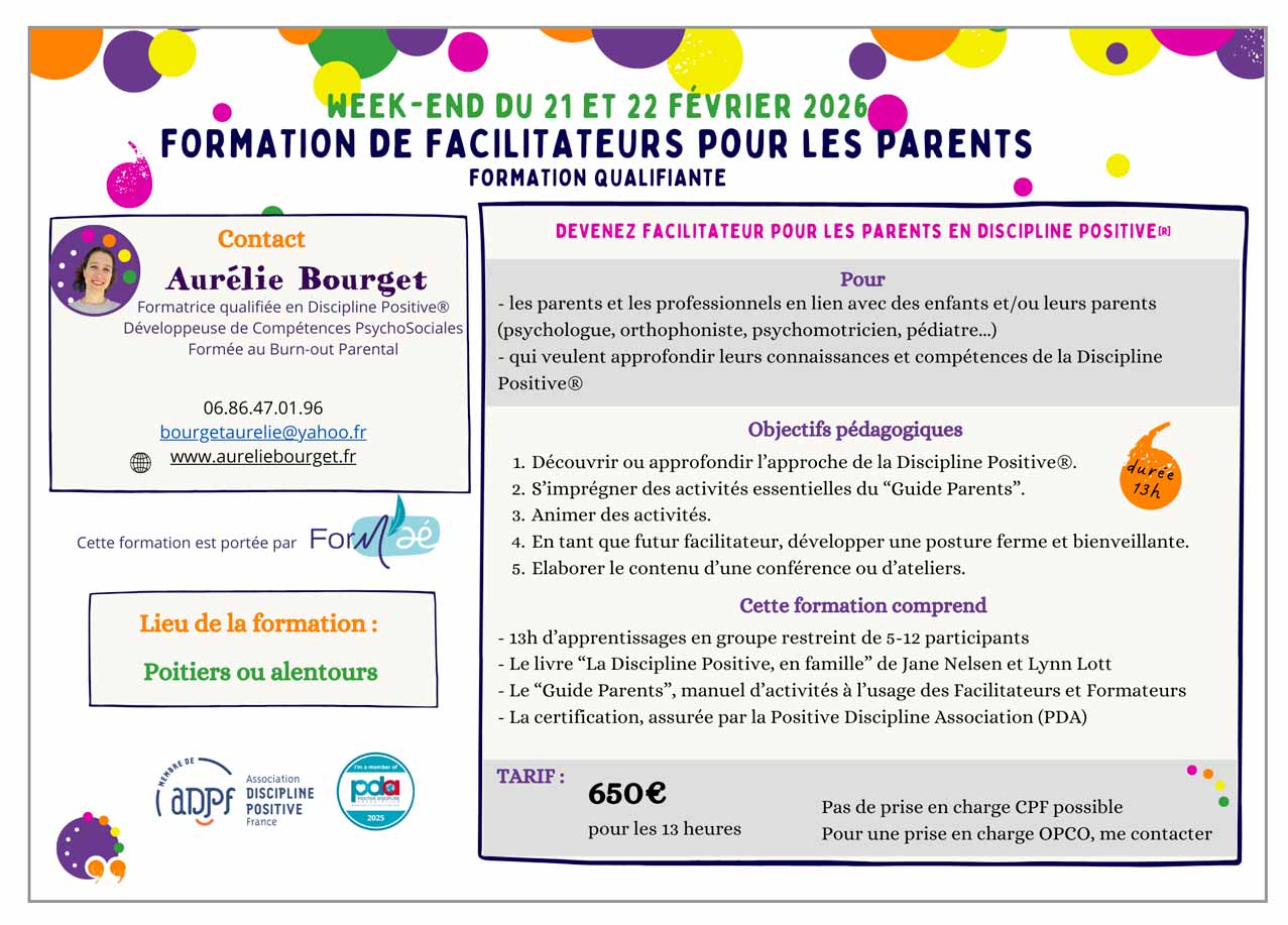 >> Visualiser l'image Devenez facilitateur pour les parents en discipline positive [R] Le week-end du 21 et 22 [...]